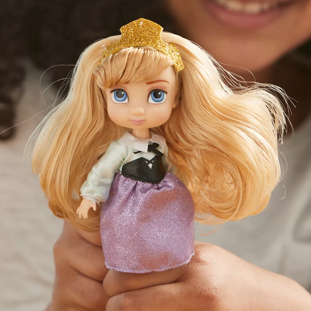 Aurore est réimaginée en petite fille, élevée dans la forêt par les trois bonnes fées qui l’ont affectueusement surnommée Rose. La poupée est vêtue de la robe champêtre avec une jupe qui brille et différents accessoires.